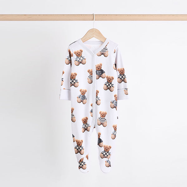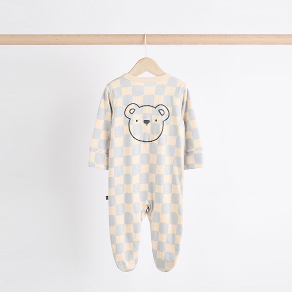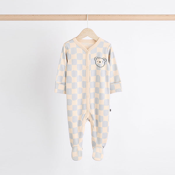 Stock up on their bedtime staples, with our selection of bear checkerboard print baby sleepsuit 3-packs in a choice of colours and prints. Each sleepsuit is made from pure cotton, featuring a popper and zipper fastening for easy changing with built-in feet for added comfort.