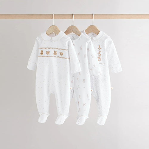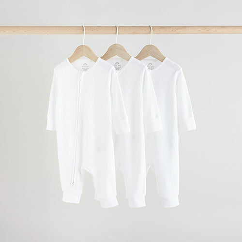 White Essential Zipped 100% Cotton Baby Sleepsuits 3 Pack