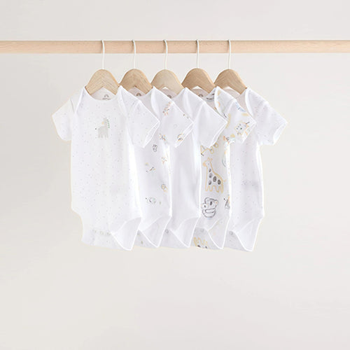 White Animal Print Short Sleeve Baby Bodysuits 5 Pack