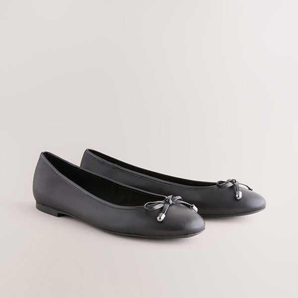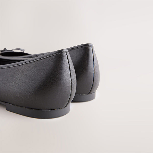 These classic black ballerina pumps feature a smooth leather upper with bow detailing, a round toe, a padded heel and Forever Comfort® cushioned footbeds for added comfort, finished with a slimline sole.