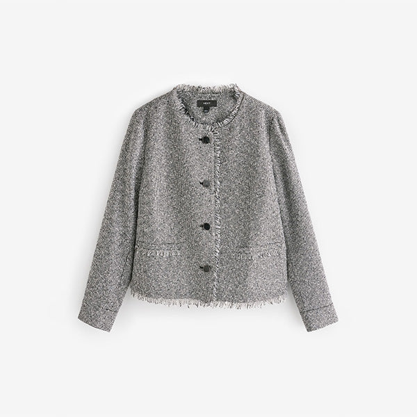 Jazz up your wardrobe this season with our collarless monochrome jacket, featuring black buttons and mock pockets. Available with a matching pencil skirt.