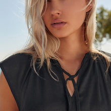 A holiday staple, our tie-neck black summer dress will take you from the beach to the bar in style. Made from a soft linen blend in classic black and offering a loose fit, this mini-length dress also features flute sleeves and a tie-neck detail. Throw it on over your swimwear for a great poolside look and add sandals for the evening.