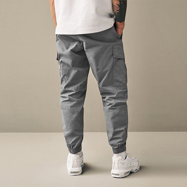 Made from soft and stretchy cotton, the trousers have a tapered silhouette with utility pockets on each side and a fully adjustable elasticated drawcord waistband designed for a comfortable fit throughout the day.