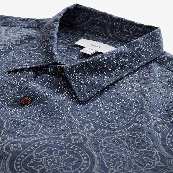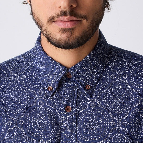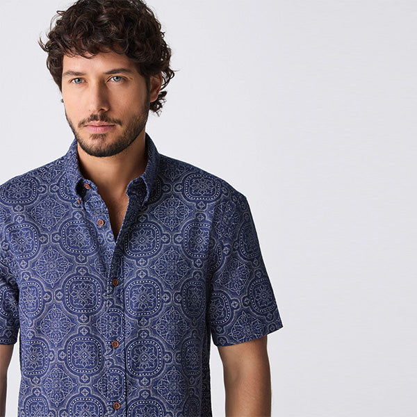 Add a pop of print to your wardrobe with our navy blue tile short sleeve shirt. Cut in a regular fit with button-up fastening, this stylish shirt is coated in a fun tile inspired print with a subtle textured finish.