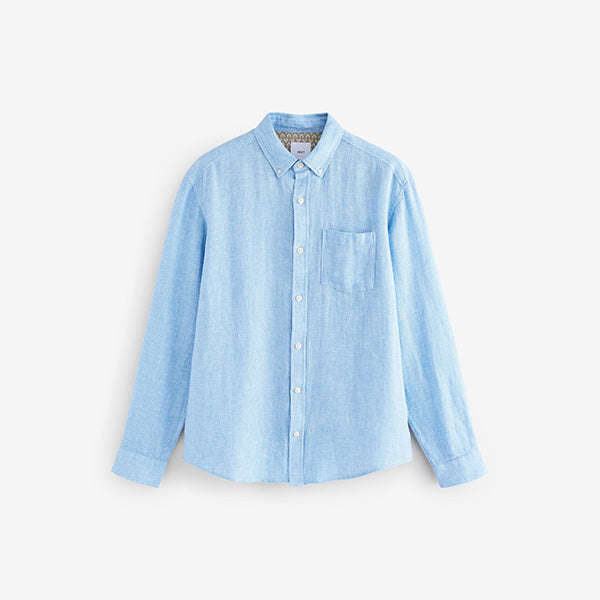 Light Blue Standard Collar Cotton Linen Blend Long Sleeve Shirt