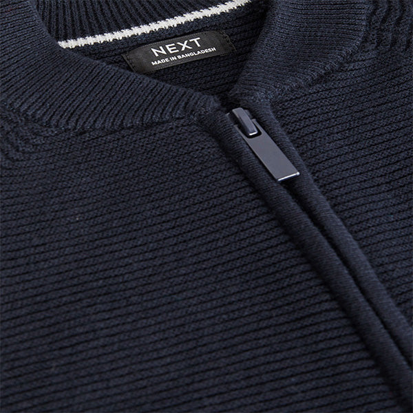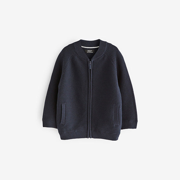This Navy cardigan has a stylish bomber-style shape with a cosy rib knitted construction, featuring long raglan sleeves, a zip fastening and ribbed cuffs. Welted slant pockets decorated the sides.