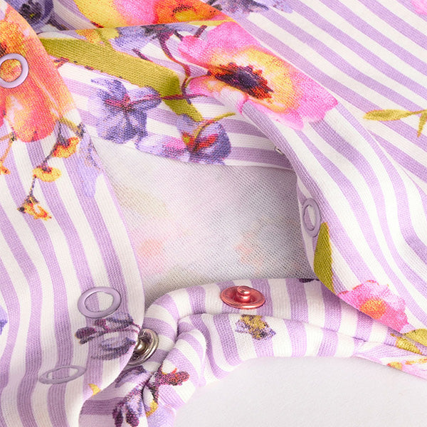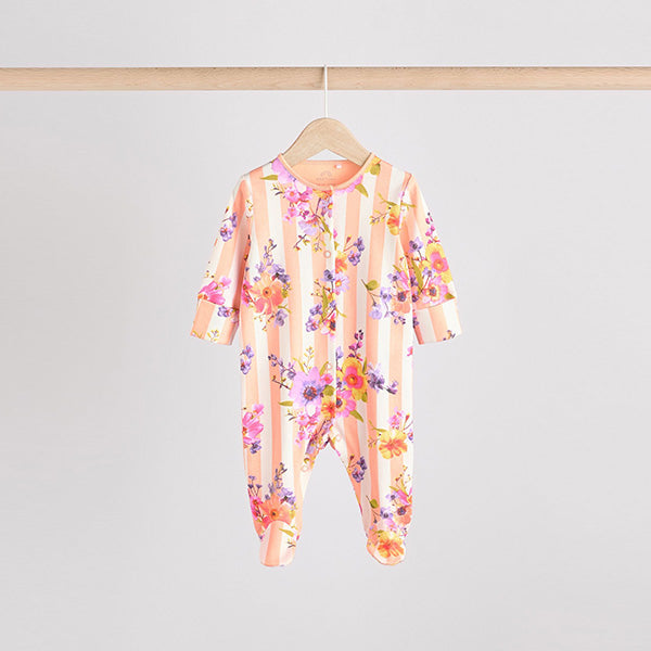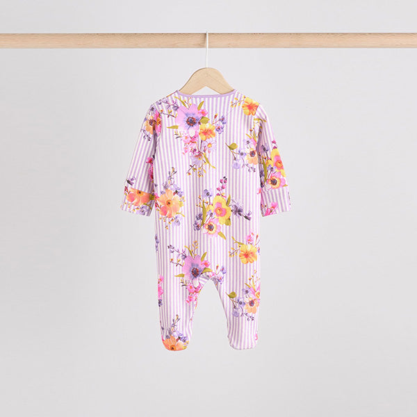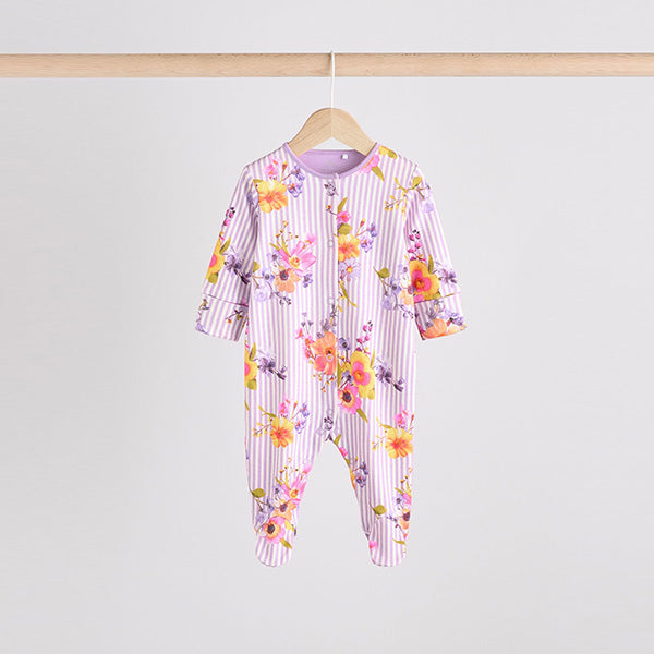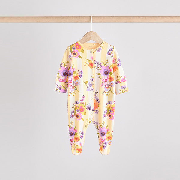 Made from pure cotton, this striped and plain base floral print 4-pack of sleepsuits are sure to keep them comfortable all night, featuring a popper front fastening for easy dressing, turn-back scratch mitts for up to size 3-6 months and anti-slip soles applied to the inner lined feet from sizes 9-12 months.