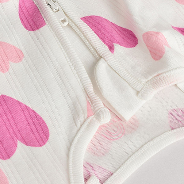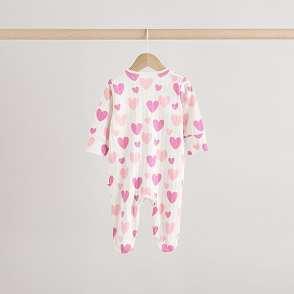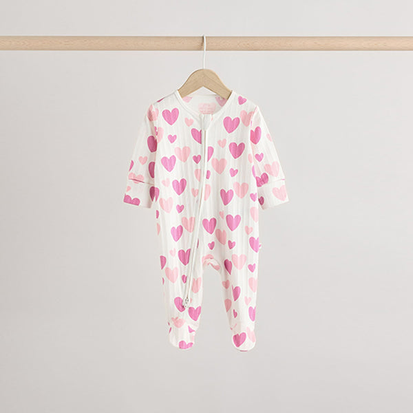 This 3-pack of sleepsuits have pops of pink tonal hues with heart and star prints, made from pure cotton with a 2-way zip fastening for easy dressing, turn-back scratch mitts up to 3-6 months and anti slip soles on the inner lined feet from 9-12 months.