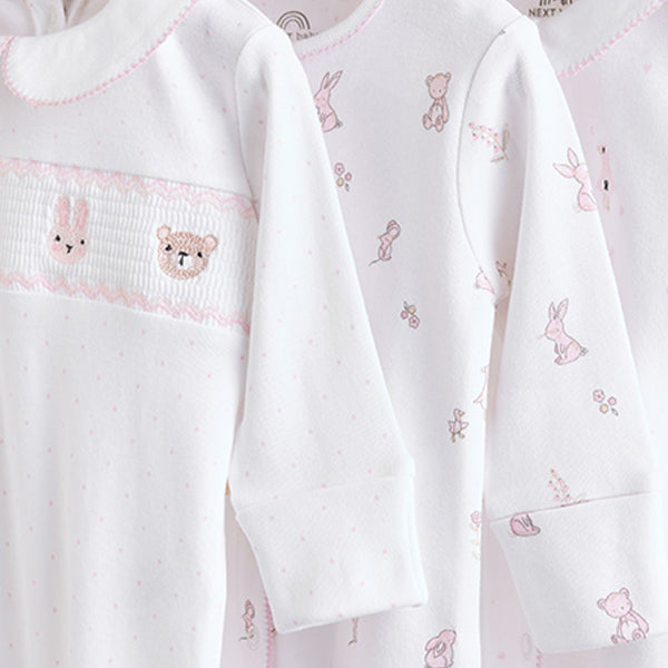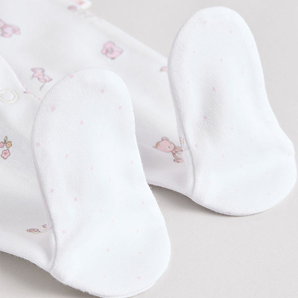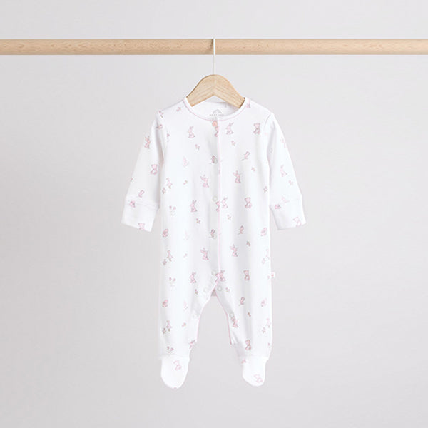 In a super soft cotton fabric, stock up on these cosy and comfortable sleepsuits for your little one. This 3-pack of sleepsuits have cute duck, rabbit and bear prints, featuring a popper front fastening to make changing a breeze, with tun-back scratch mitts up to 3-6 months and an anti-slip sole print from 9-12 months, finished with inner lined feet.