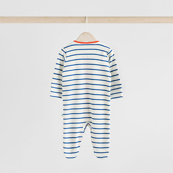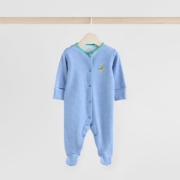 This 3-pack of pure cotton blue and striped sleepsuits are super comfortable, featuring a popper fastening for easy wear, embroidered detailing and a round collar. Turn back scratch mitts have been added up to 3-6 months for extra comfort, with inner lined feet and an anti-slip sole print from 9-12 months.
