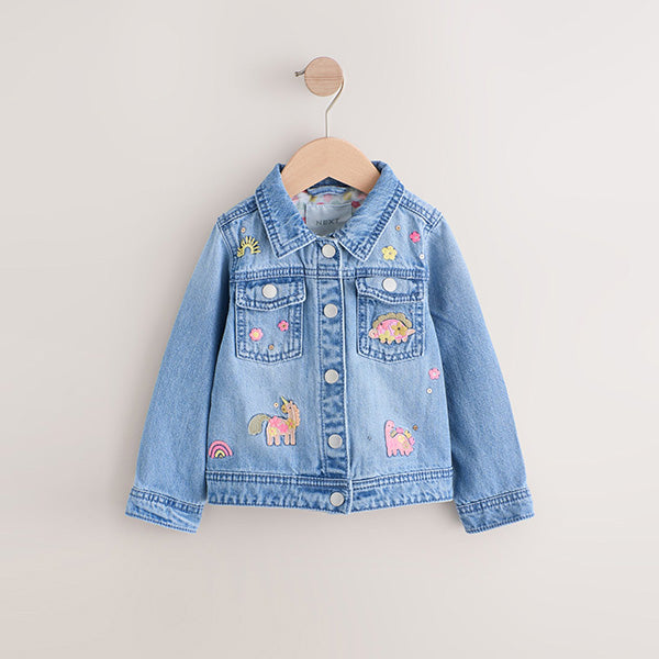 This western-inspired jacket is made from a pure-cotton denim fabric, featuring a mid-blue wash with a press-stud fastening, adorable embroidered patches including a unicorn and other characters, finished with chest pockets and a classic collar.