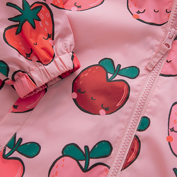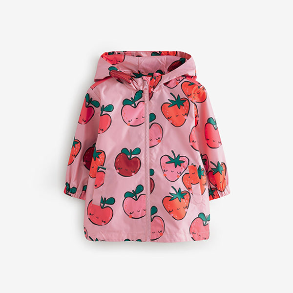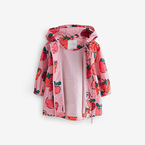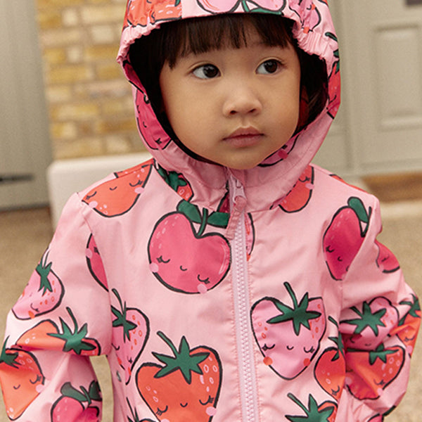 This handy and lightweight red and pink cagoule jacket is perfect for unpredictable weather, with a shower resistant outer shell in a strawberry all-over print, finished with a comfortable cotton lining, a full zip fastening and a set-in hood.
