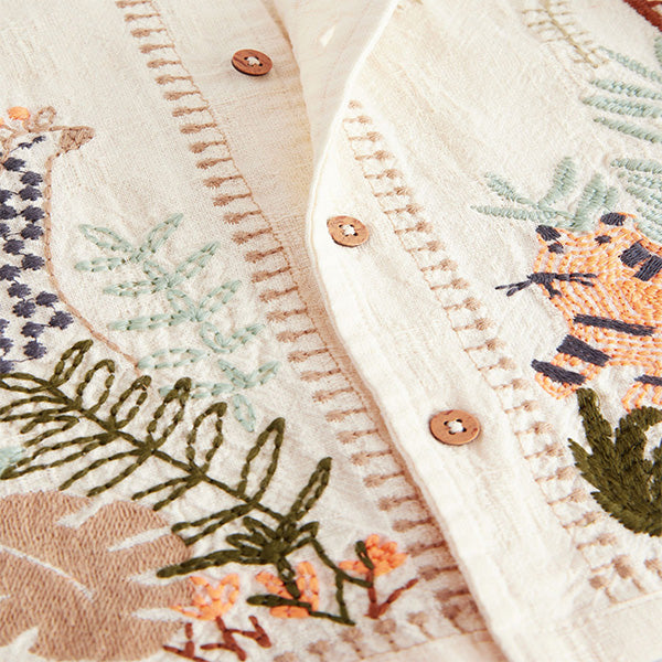Perfect for a summer holiday, this ecru white pure-cotton short sleeve shirt has a button-up fastening, a textured feel and embroidered safari detailing that's both smart looking and fun, finished with a classic collar.