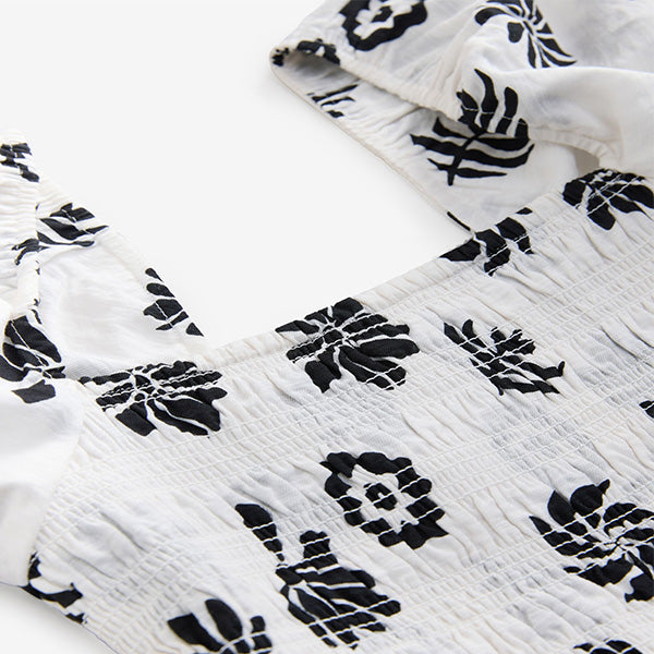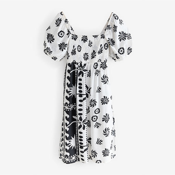 A beautiful addition to your summer wardrobe, this gorgeous dress is perfect for special occasions or sunny holidays, featuring a lightweight fabric with shirred detailing and short puff sleeves that can be worn on or off the shoulder, cut to a midi length.