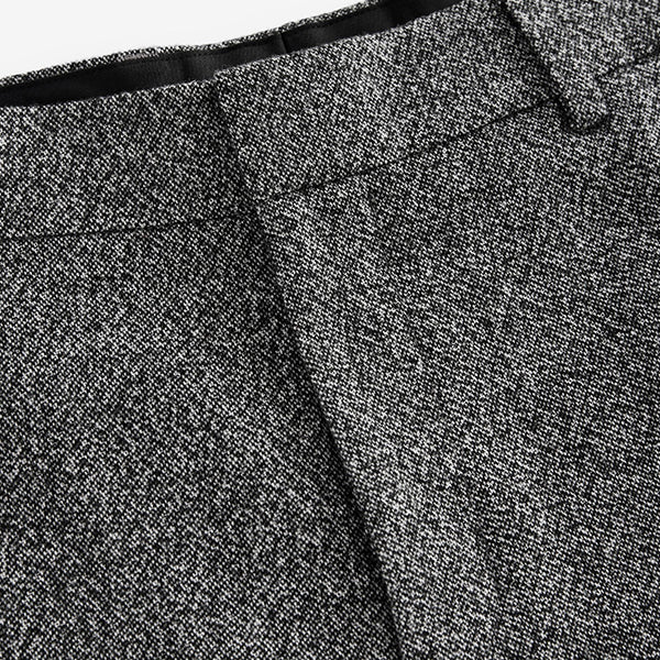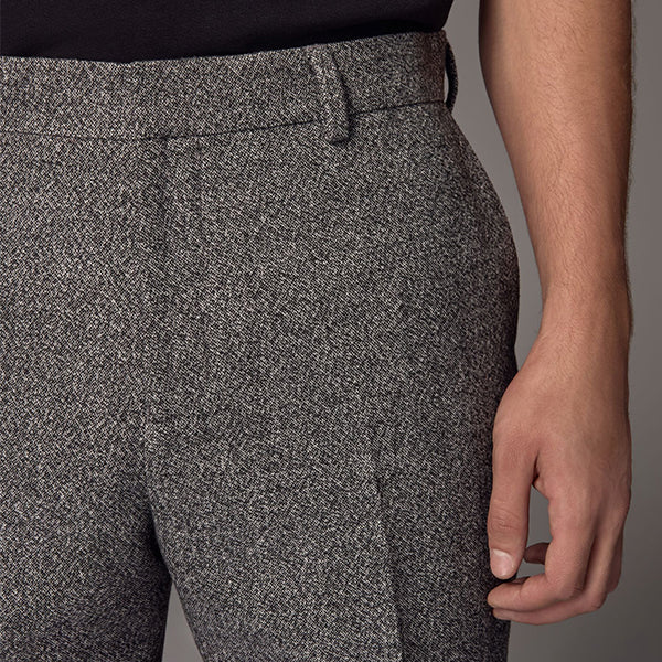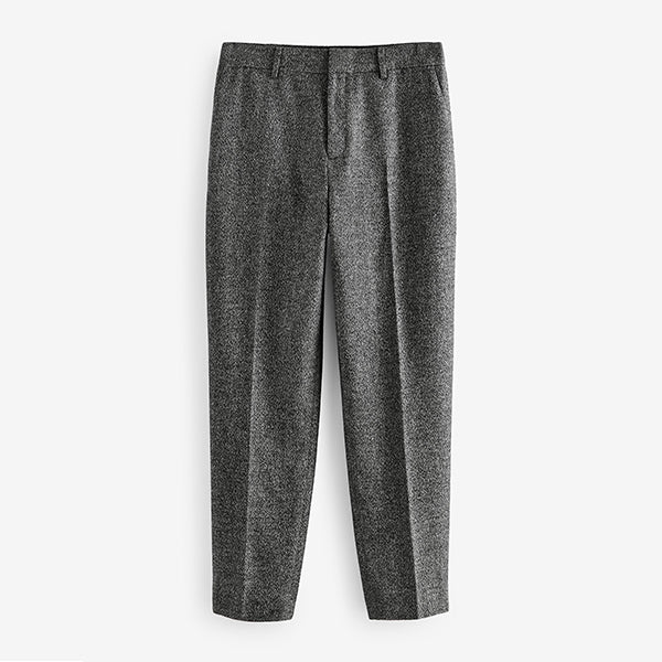In a slim fit, these stylish charcoal grey trousers feature a textured fabric with added wool, a central leg crease and a formal waistband, finished with side and back pockets and a hook and zip fastening.