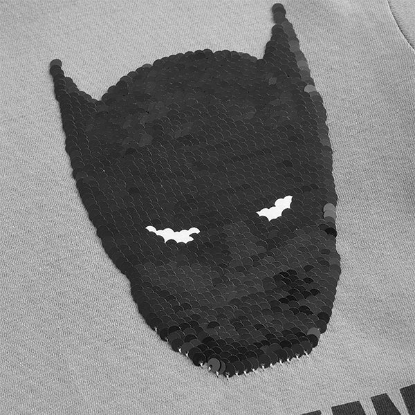 Your little super hero will love this long sleeve t-shirt in pure cotton, featuring a charcoal grey back drop with flippy sequin Batman designs and Gotham city prints, finished with a crewneck collar.