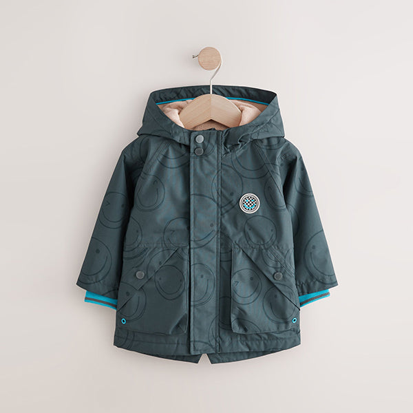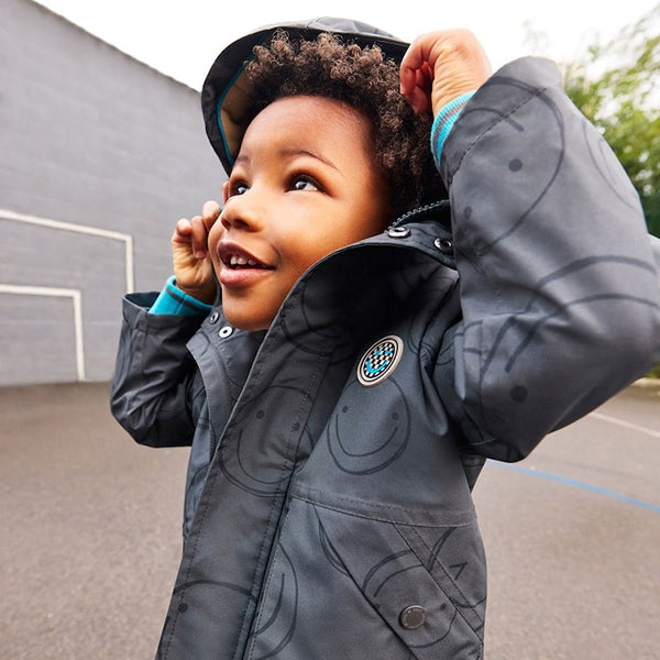 With a waterproof smiling face printed outer shell, pop this stylish black jacket over their outfit for shielding against the elements, with a warm microfleece lining, taped seams, dual press-stud pockets and a set-in hood.