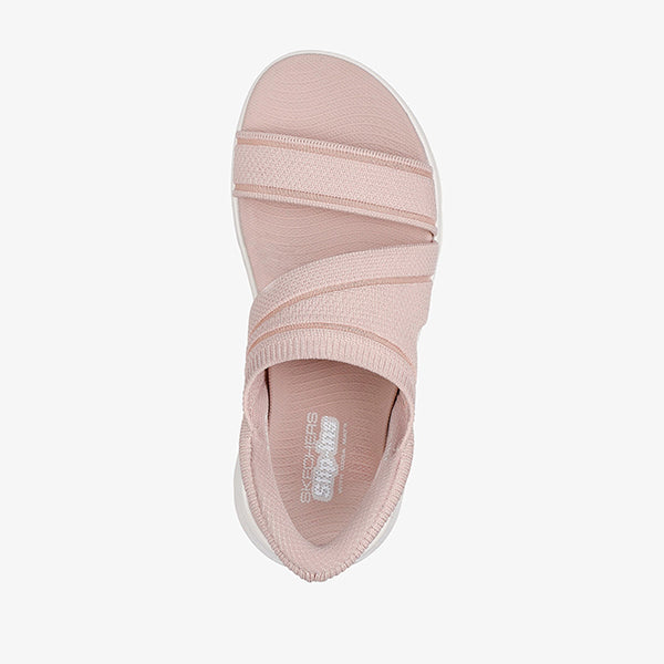 Experience an effortless way to wear your favorite sport sandal with Skechers Hands Free Slip-ins®: GO WALK Flex™ Sandal - Enticing. Designed with our Heel Pillow®, this strappy slip-on sandal features a knitted upper with a Skechers Hands Free Slip-ins® back heel, contoured Goga Mat® footbed and lightweight ULTRA GO® cushioning.