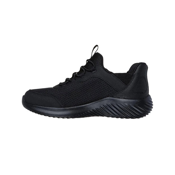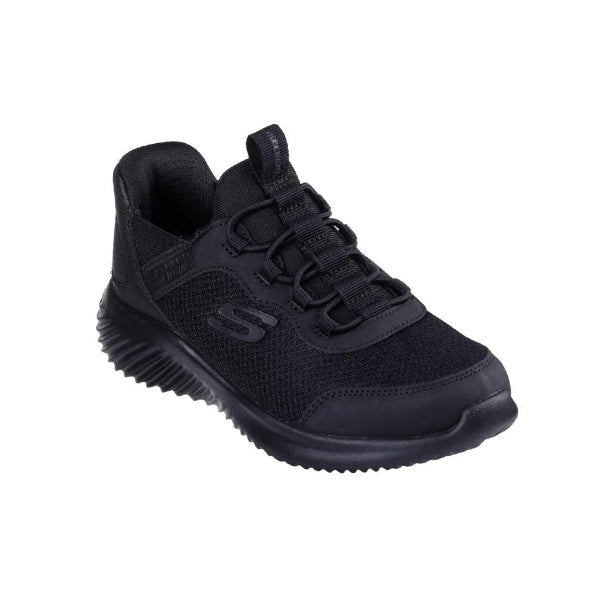 Effortless comfort to start their day is here with Skechers Hands Free Slip-ins®: Bounder - Brisk-Burst. Designed with our exclusive Heel Pillow™, this TOUCHLESS FIT® slip-on style features a mesh and synthetic upper with stretch laces and a cushioned Skechers Air-Cooled Memory Foam® insole.