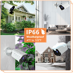 Various Applicable ScenariosThe wireless outdoor security cameras are IP66 waterproof and can withstand operating temperatures from -4°F to 122°F (-20°C to 50°C). Even in extreme weather conditions, it can work normally. |
