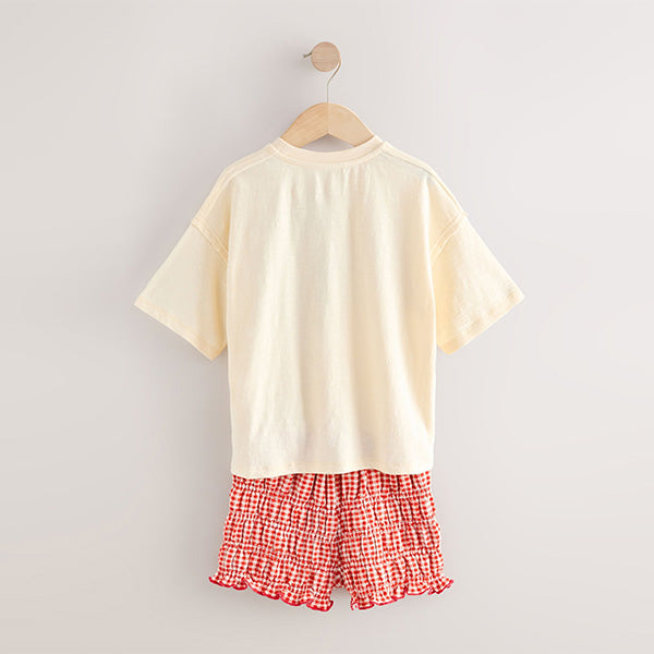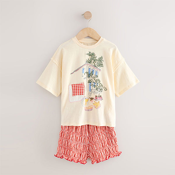 Amp up her summer styling with this ecru t-shirt and bloomer shorts set. Featuring a boxy fit t-shirt with a graphic print design and elasticated shorts with a textured fabric, this dreamy duo is ideal for sunny adventures.