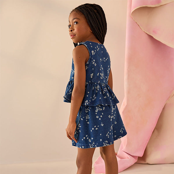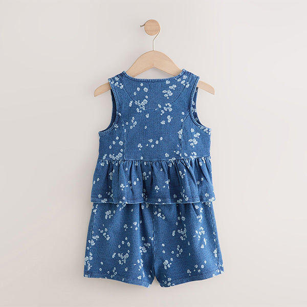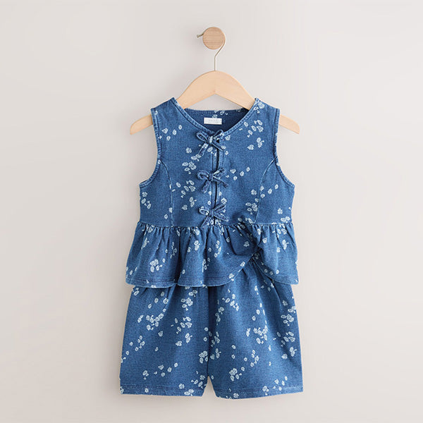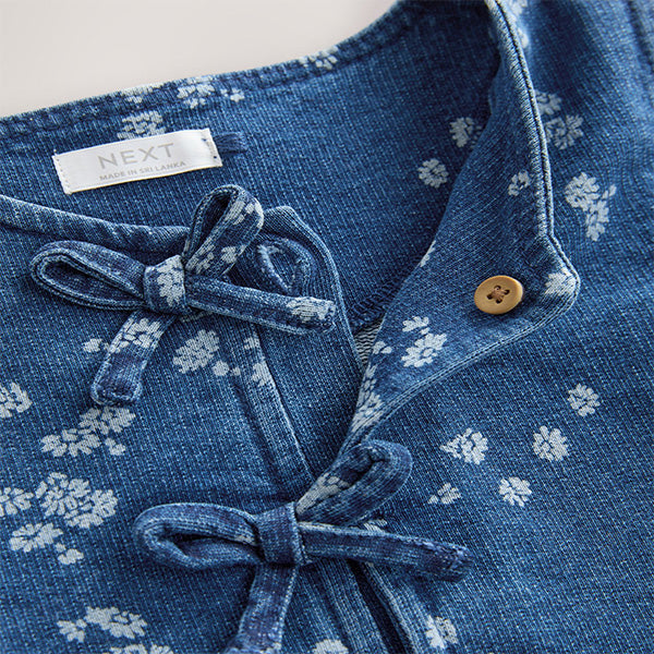 Brimming with florals, this blue denim waistcoat and shorts set makes a fabulous addition to her summer wardrobe. In pure cotton, it features a frill hem waistcoat with bows and paperbag shorts with an elasticated waist.